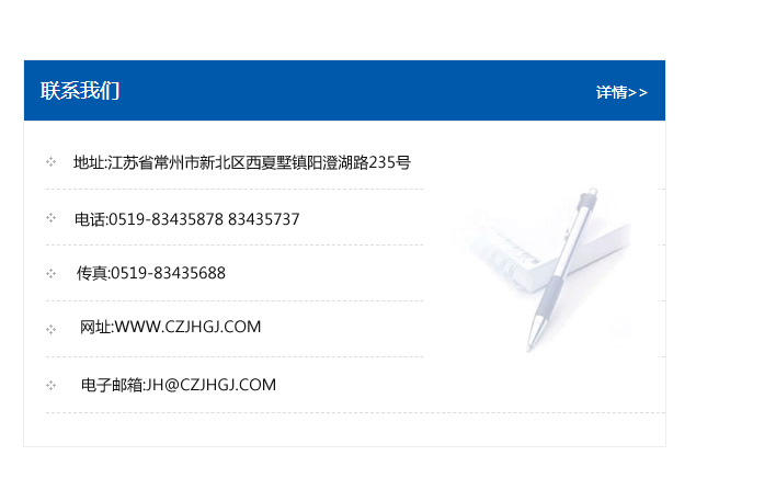 地址:常州市新北區友邦商務大廈1幢16、17層  電話:0519-85101652  傳真:0519-85112595  郵編:213022  網址:www_cz-jiayue_cn.kalitisi.com  郵箱:xiajifengaa@163.com